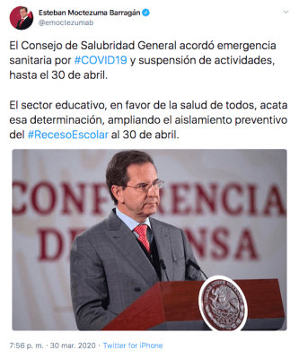 Ciudad de México, 30 de marzo de 2020.- Esta noche, Esteban Moctezuma Barragán, secretario de Educación Pública, anuncio que se amplía el aislamiento preventivo escolar hasta el 30 de abril. Esto, en concordancia con las medidas que implemento el Consejo de Salubridad General, por la emergencia sanitaria.