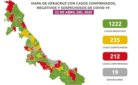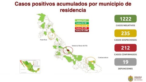 La cifra de positivos es 212 en 47 ayuntamientos: Veracruz 69, Boca del Río 29, Coatzacoalcos y Poza Rica 20, Xalapa 7, Amatlán de los Reyes, Córdoba, Emiliano Zapata y Minatitlán, 4; Alvarado, Martínez de la Torre, José Azueta y Tlacotalpan, 3; Cosoleacaque, Ixtaczoquitlán, Medellín, San Andrés Tuxtla y Santiago Tuxtla, 2; Agua Dulce, Amatitlán, Ángel R. Cabada, La Antigua, Ayahualulco, Cerro Azul, Chacaltianguis, Chinampa de Gorostiza, Coatepec, Cosamaloapan, Coscomatepec, Fortín, Ixhuatlán del Café, Ixhuatlán de Madero, Ixhuatlán del Sureste, Naranjos, Miahuatlán, Nogales, Orizaba, Pánuco, Perote, Rafael Delgado, Río Blanco, Tantoyuca, Tierra Blanca, Totutla, Tres Valles, Tuxpan y Úrsulo Galván, 1.