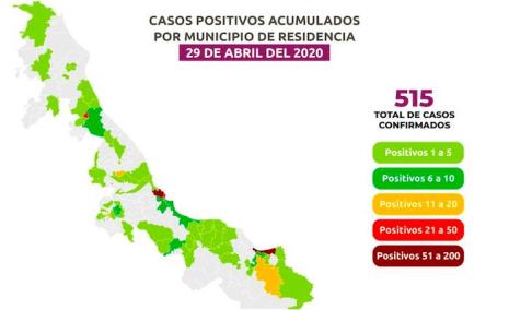 La cifra de positivos es 515 en 69 demarcaciones: Veracruz 187, Coatzacoalcos 57, Boca del Río 47, Poza Rica 42, Minatitlán 12, Orizaba y Xalapa 11; Alvarado y Papantla 8; Córdoba, Cosoleacaque, Fortín y Medellín 7; Cosamaloapan 6; Martínez de la Torre y San Andrés Tuxtla 5; Amatlán de los Reyes, Emiliano Zapata, José Azueta, Santiago Tuxtla, Tierra Blanca y Tuxpan 4; Acayucan, Coatzintla, Ixtaczoquitlán, Misantla y Tlacotalpan 3; La Antigua, Ayahualulco, Cerro Azul, Jáltipan, Maltrata, Perote y Puente Nacional 2.