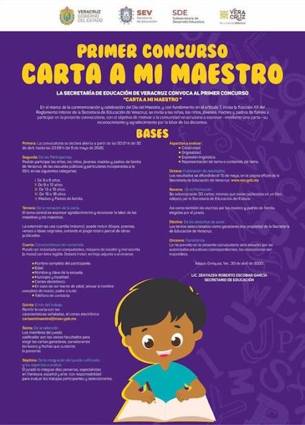 El titular de la SEV, Zenyazen Escobar García, comentó que los interesados (de escuelas públicas y particulares) podrán expresar, en una extensión máxima de una cuartilla, la loable labor de las y los profesores. La redacción puede ser en computadora, máquina de escribir o a mano con letra legible, acompañada de dibujos, poemas, versos e ideas originales.