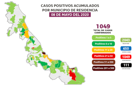 El número de positivos es mil 049 en 89 demarcaciones: Veracruz 396, Coatzacoalcos 146, Poza Rica 83, Boca del Río 71, Minatitlán 33, Xalapa 23, Cosoleacaque 17, Córdoba y Orizaba 14, Alvarado y Tuxpan 13, Medellín y Papantla 12, Fortín y Tierra Blanca 10, Cosamaloapan y San Andrés Tuxtla 9, Santiago Tuxtla y Tihuatlán 7; Coatzintla, Ixtaczoquitlán, Martínez de la Torre, Misantla y Nanchital 6; Acayucan, Agua Dulce, Emiliano Zapata y Perote 5; Amatlán de los Reyes, Ayahualulco, Cerro Azul, Jáltipan, José Azueta y Tlacotalpan 4; La Antigua, Cazones, Coatepec y Mariano Escobedo 3.