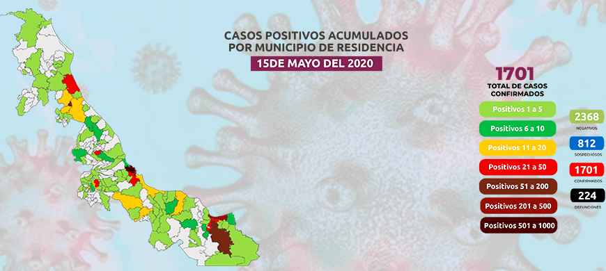 Xalapa, Ver., 15 de mayo de 2020.- Dando seguimiento al panorama del coronavirus (COVID-19), la Secretaría de Salud (SS) informa que, al corte de las 19:00 horas, en la entidad han sido estudiados 4 mil 881 casos, de los cuales 2 mil 368 resultaron negativos. 812 sospechosos de 78 municipios continúan en investigación: Veracruz 330, Coatzacoalcos 68, Poza Rica 58, Boca del Río 55, Minatitlán … Continúa leyendo Veracruz entre las fases 2 y 3, presenta un crecimiento acelerado de contagios y próximo al punto más crítico