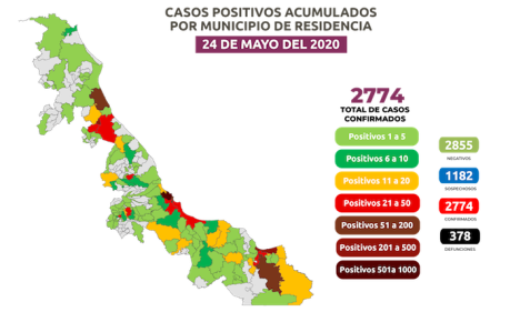 La cifra de positivos acumulados es de 2 mil 774 en 123 demarcaciones y 547 activos: Veracruz 1067, Coatzacoalcos 377, Poza Rica 241, Boca del Río 148, Minatitlán 130, Tuxpan 63, Córdoba 45, Xalapa 44, Cosoleacaque 43, Medellín 39, Papantla 30, Coatzintla 29, Alvarado 27, Orizaba 26, Cosamaloapan 20, Tihuatlán 19, Nanchital y San Andrés Tuxtla 17, Tierra Blanca 16; La Antigua, Fortín, Jáltipan y Martínez de la Torre 14; Acayucan y Perote 13; Agua Dulce y Las Choapas 12.