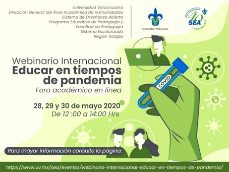 Xalapa, Ver., 25 de mayo de 2020.- La pandemia por la enfermedad de Covid-19 es un evento que impacta a muchos niveles y afecta directamente a la educación, por tal motivo la Universidad Veracruzana (UV), a través de la Dirección General del Área Académica de Humanidades, el programa educativo de Pedagogía del Sistema de Enseñanza Abierta (SEA) y la Facultad de Pedagogía, realizarán el Foro Académico en Línea “Educar en tiempos de pandemia”.