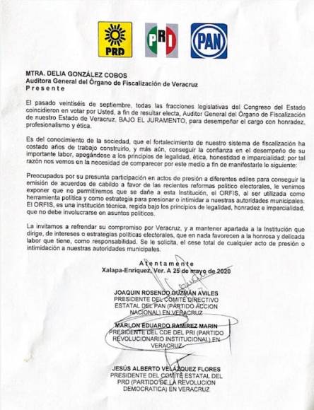 «Hoy me dirijo a usted, auditora general del ORFIS en Veracruz, maestra Delia González Cobos, para informarle que junto con los presidentes locales del PAN y del PRD, firmamos un documento donde la invitamos a refrendar su compromiso de mantener apartada la Institución que hoy dirige de intereses o estrategias políticas electorales, ya que nos hemos enterado mediante notas periodísticas, de su presunta participación en actos de presión a diferentes ediles para aprobar en sus cabildos las recientes reformas electorales», advirtió.