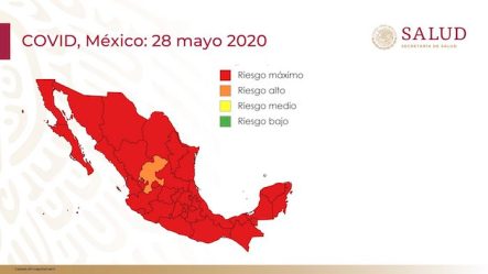 Al 28 de mayo el mapa de la República Mexicana se observa en rojo, a excepción de Zacatecas que está de color naranja.