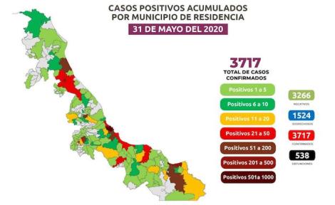 La cifra de positivos acumulados es de 3 mil 717 en 134 demarcaciones y 541 activos: Veracruz 1443, Coatzacoalcos 440, Poza Rica 320, Boca del Río 181, Minatitlán 158, Tuxpan 91, Córdoba 74, Medellín 63, Xalapa 59, Cosoleacaque 57, Papantla 50, Coatzintla 42, Orizaba 37, Alvarado y Tihuatlán 33, Cosamaloapan 28, San Andrés Tuxtla 24; La Antigua, Martínez de la Torre y Nanchital 23; Fortín 21; Las Choapas 20; Agua Dulce, Perote y Tierra Blanca 19; Jáltipan 16, Río Blanco 15, Acayucan y Santiago Tuxtla 14, Manlio Fabio Altamirano 13, Emiliano Zapata e Ixtaczoquitlán 11.