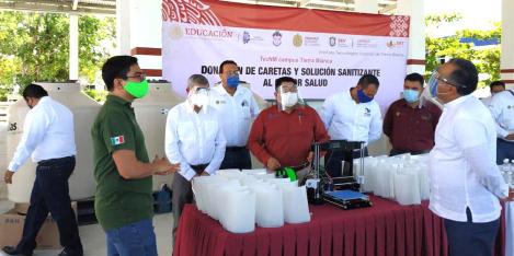 Tierra Blanca, Ver., 04 de junio de 2020.- En el marco de las acciones contra la pandemia por COVID-19, los institutos tecnológicos del estado donaron 5 mil 800 litros de solución desinfectante, 230 caretas, 80 litros de gel antibacterial, 500 cubrebocas y materiales para elaborar 7 mil más, en beneficio de trabajadores de la salud que atienden a pacientes con coronavirus.