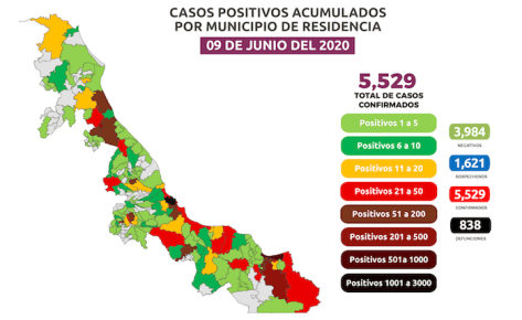 La cifra de positivos acumulados es de 5 mil 529 en 148 demarcaciones; 3 mil 56 recuperados, mil 635 en vigilancia y 840 activos: Veracruz 2045, Coatzacoalcos 606, Poza Rica 425, Minatitlán 242, Boca del Río 234, Córdoba 154, Tuxpan 136, Xalapa 124, Cosoleacaque 93, Medellín 91, Papantla 82, Orizaba 79, Cosamaloapan 61, Coatzintla 57, San Andrés Tuxtla 49, Fortín 48, Tihuatlán 43, Alvarado 40, Nanchital 39, Martínez de la Torre 37, Las Choapas 35, Tierra Blanca 33, Perote 32, Agua Dulce y La Antigua 29, Jáltipan y Río Blanco 25.