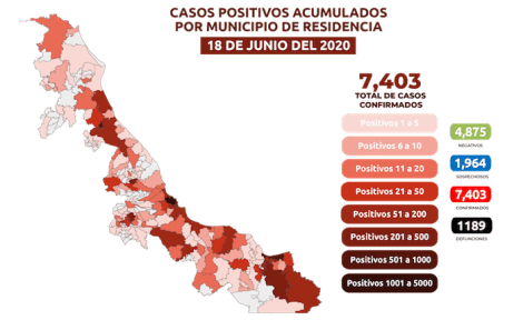 La cifra de positivos acumulados es de 7 mil 403 en 158 demarcaciones; 4 mil 260 recuperados, mil 954 en vigilancia y 990 activos: Veracruz 2583, Coatzacoalcos 735, Poza Rica 501, Minatitlán 332, Boca del Río 290, Córdoba 271, Xalapa 204, Tuxpan 186, Cosoleacaque 128, Orizaba 124, Papantla 113, Medellín 107, Cosamaloapan 102, San Andrés Tuxtla 93, Fortín 76, Coatzintla 67, Martínez de la Torre y Tierra Blanca 64, Nanchital 59; Alvarado, La Antigua y Las Choapas 51; Tihuatlán 49, Agua Dulce 45, Perote 44, Acayucan 42, Jáltipan 39, Río Blanco 37, Santiago Tuxtla 33 y Coatepec 31.