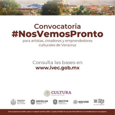 Xalapa, Ver., 19 de junio de 2020.- En coordinación con la Secretaría de Cultura federal, el Instituto Veracruzano de la Cultura (IVEC) invita a creadores, emprendedores culturales y artistas escénicos y visuales a registrarse en la convocatoria #NosVemosPronto, que concluirá este 21 de junio.