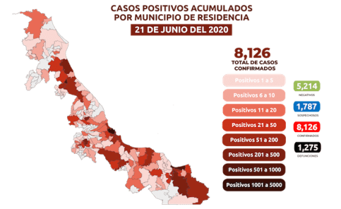La cifra de positivos acumulados es de 8 mil 126 en 160 demarcaciones; 4 mil 776 recuperados, 2 mil 75 en vigilancia y mil 146 activos: Veracruz, 2721, Coatzacoalcos 765, Poza Rica 523, Córdoba 360, Minatitlán 357, Boca del Río 309, Xalapa 228, Tuxpan 216, Orizaba 152; Cosoleacaque 143, Cosamaloapan 128, Papantla 122; Medellín 112, San Andrés Tuxtla 109, Fortín 103, Tierra Blanca 73, Coatzintla 72; Las Choapas, Martínez de la Torre 66; Nanchital 65, La Antigua 59, Alvarado 54, Perote, Tihuatlán 50; Acayucan, Río Blanco 49, Agua dulce 48 y Jáltipan 44.