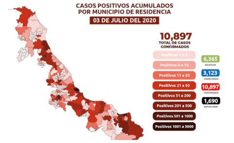 La cifra de positivos acumulados es 10 mil 897 (+ 226 nuevos) en 174 municipios, de los cuales mil 56 activos.