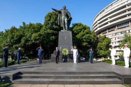 Washington, EE.UU., 08 de julio de 2020.- El presidente Andrés Manuel López Obrador inició sus actividades en Washington, Estados Unidos, colocando ofrendas florales en los monumentos a Abraham Lincoln y Benito Juárez García.