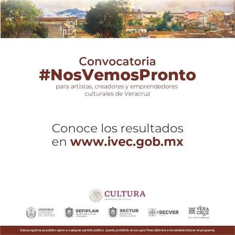 Xalapa, Ver., 15 de julio de 2020.- A través de su sitio web, el Instituto Veracruzano de la Cultura (IVEC) dio a conocer los resultados de la convocatoria #NosVemosPronto, emitida por el Gobierno del Estado con apoyo de la Secretaría de Cultura federal, con la finalidad de estimular la producción artística y garantizar el libre acceso de la población a contenidos culturales de calidad.