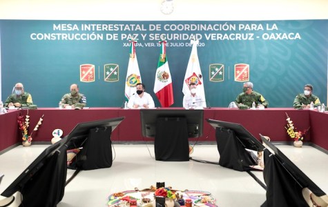 Xalapa, Ver., 15 de julio de 2020.- El gobernador Cuitláhuac García Jiménez y su homólogo de Oaxaca, Alejandro Murat Hinojosa, presentaron los resultados de la Mesa Interestatal de Coordinación para la Construcción de la Paz y Seguridad, a cinco meses de haber iniciado operaciones en la zona limítrofe entre ambas entidades, alineados a la estrategia del presidente Andrés Manuel López Obrador.