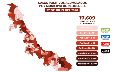La cifra de positivos acumulados es de 17 mil 609 (+203 nuevos) en 191 municipios; mil 624 de éstos activos. Se suman los municipios de Tatatila y Texcatepec con un caso cada uno.