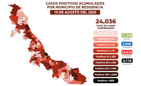 Xalapa, Ver., 10 de agosto de 2020.- En seguimiento al panorama del coronavirus (COVID-19), la Secretaría de Salud (SS) informa que, al corte de las 19:00 horas, en la entidad han sido estudiados 38 mil 342 casos, de los cuales, 11 mil 740 resultaron negativos.