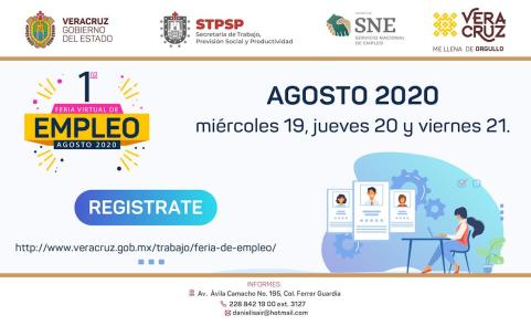 Xalapa, Ver., 14 de agosto 2020.- La Secretaría de Trabajo, Previsión Social y Productividad (STPSP), a través del Servicio Nacional de Empleo (SNE), realizará los días 19, 20 y 21 de agosto la primera Feria Virtual del Empleo Veracruz Agosto 2020, en la que 55 empresas ofertarán más de mil 800 vacantes.