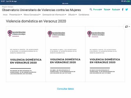 Xalapa, Ver., 25 de agosto de 2020.- A partir del resguardo domiciliario establecido dada la pandemia de Covid-19, el Observatorio Universitario de Violencias contra las Mujeres (OUVMujeres) de la Universidad Veracruzana (UV) especifica en sus registros la violencia familiar o doméstica de la entidad.