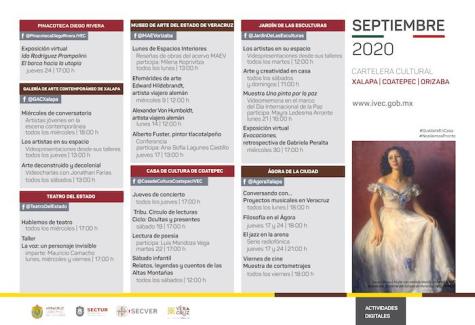 Xalapa, Ver., 31 de agosto de 2020.- El Instituto Veracruzano de la Cultura invita a las actividades virtuales que ha preparado en cada uno de sus recintos para el mes de septiembre; así, por ejemplo, en Papantla, el Museo Teodoro Cano llevará a cabo el programa “Sábados de charlas”, mientras que el jueves 10, Álvaro Valencia Salas ofrecerá el recital Remembranzas musicales.
