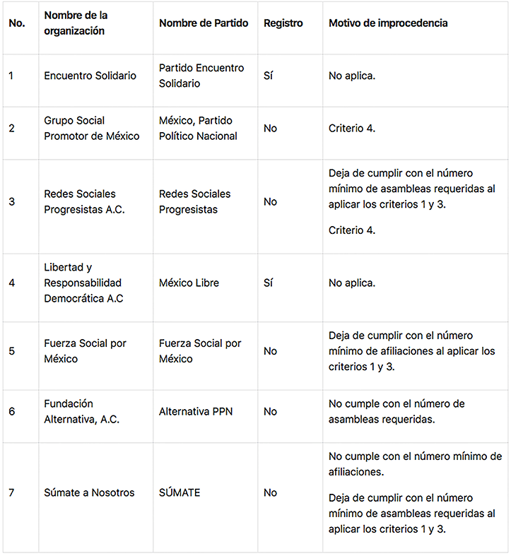 Derivado de la aplicación de dichos criterios, asambleas o afiliaciones que preliminarmente eran válidas fueron descontadas a cada organización en la sesión de la Comisión y, en consecuencia, procede el registro de dos organizaciones como partido político: Partido Encuentro Solidario y México Libre.