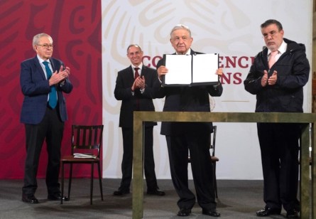 Antes de enviarlo al Senado, el presidente firmó el documento en el Salón de la Tesorería, acompañado del secretario de Salud, Jorge Alcocer Varela y del subsecretario de Salud, Hugo López-Gatell Ramírez, quienes antecedieron este acto con la presentación del reporte semanal de avances del control de la epidemia de COVID-19.