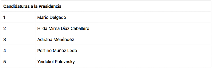 Con base en ese análisis, la Comisión determinó que en el caso de la Secretaría General se realicen dos preguntas en la encuesta abierta para preguntar de manera independiente por la preferencia entre los candidatos y las candidatas a la Secretaría General aclarando al entrevistado que el resultado está vinculado a la elección de la persona que ocupe la Presidencia. De esa forma las 9 candidatas y 4 candidatos que participarán en la encuesta abierta son los siguientes: