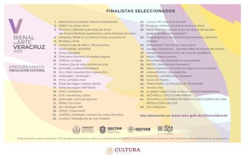 Son 45 proyectos escogidos para montar una exposición a partir del 26 de noviembre. En esa fecha el jurado dará a conocer al primero, segundo y tercer lugar, que recibirán tres premios de adquisición y sus obras pasarán a formar parte del acervo del IVEC. También se otorgarán seis menciones honoríficas. Posteriormente, esta edición de la Bienal quedará plasmada en un catálogo digital alojado en el sitio web del Instituto.