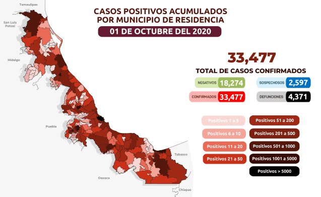 Xalapa, Ver., 01 de octubre de 2020.- En seguimiento al panorama del coronavirus (COVID-19), la Secretaría de Salud (SS) informa que, al corte de las 19:00 horas, en la entidad han sido estudiados 54 mil 348 casos, de los cuales 18 mil 274 resultaron negativos.