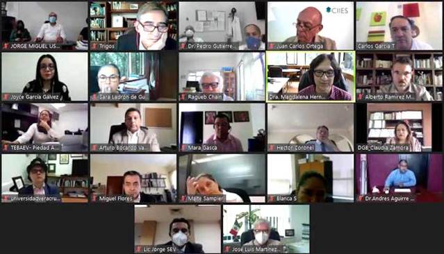 A través de Zoom, en la reunión estuvieron: Magdalena Hernández Alarcón, secretaria Académica de la UV; Jorge Ramírez en representación de Zenyazen Escobar García, titular de la SEV; asimismo, los titulares de las áreas académicas de Humanidades, Técnica, Económico-Administrativa, Artes y Ciencias de la Salud, José Luis Martínez Suárez, Eduardo Gasca Herrera, Arturo Bocardo Valle, Miguel Flores Covarrubias y Pedro Gutiérrez Aguilar, respectivamente.