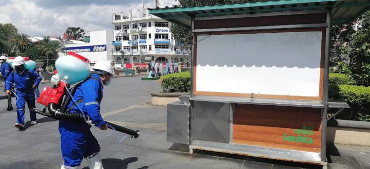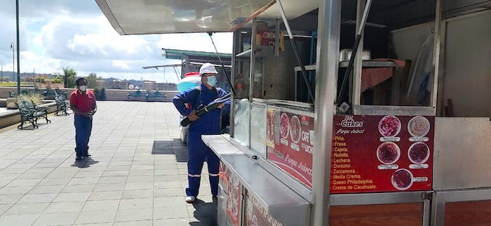 Xalapa, Ver., 19 de octubre de 2020.- Para contar con la mayor seguridad posible y evitar contagios del Coronavirus SARS-CoV-2, personal de la Dirección de Protección Civil municipal realizó la desinfección de casetas y espacios comerciales del parque Benito Juárez, previo a su reapertura parcial.