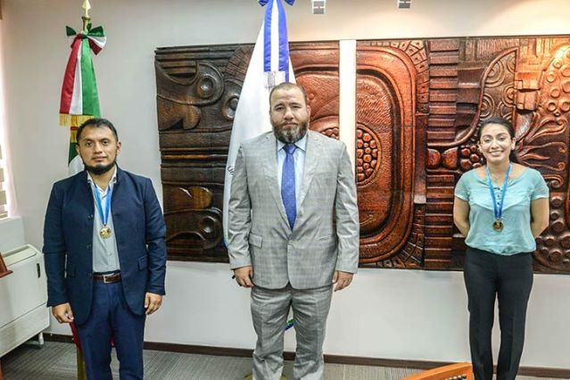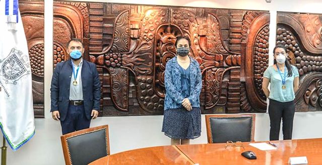 Sara Ladrón de Guevara felicitó a Pablo Adrián, Miriam y Daniel, por el excepcional logro y les exhortó a mantenerse en este camino, lo mismo en su formación académica que en su vida profesional; también les felicitó por recibir la Medalla que honra la memoria del Rector fundador de la UV, “que siempre será su casa de estudios”.