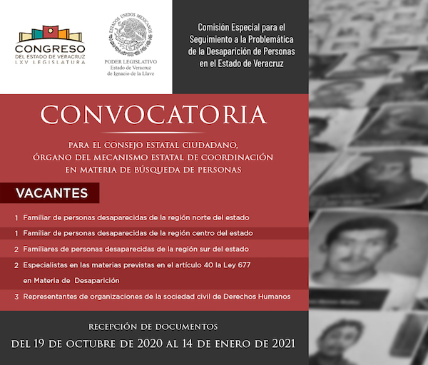 Xalapa, Ver., 20 de otubre de 2020.- El Congreso del Estado emitió, este 19 de octubre, la Convocatoria Pública para cubrir nueve vacantes en el Consejo Estatal Ciudadano, Órgano del Mecanismo Estatal de Coordinación en Materia de Búsqueda de Personas.