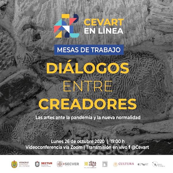 Xalapa, Ver., 25 de octubre de 2020.- El Instituto Veracruzano de la Cultura (IVEC), a través del Centro Veracruzano de las Artes (CEVART) “Hugo Argüelles”, invita a escuchar la tercera mesa de trabajo virtual “Diálogos entre creadores”, donde diez artistas de diferentes disciplinas abordarán el tema “Las artes ante la pandemia y la nueva normalidad”.La cita es el próximo 26 de octubre de 19:00 a 21:00 horas, a través de Zoom y Facebook Live.
