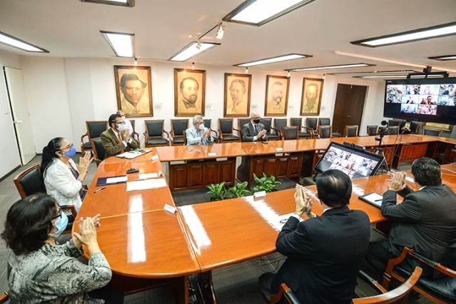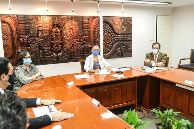 En la Sala de Juntas estuvieron presentes la secretaria Académica, Magdalena Hernández Alarcón; el secretario de Administración y Finanzas, Salvador Tapia Spinoso; el secretario de Desarrollo Institucional, Octavio Ochoa Contreras; el abogado general, Alberto Islas Reyes; y Raciel Martínez Gómez, director general de Comunicación Universitaria.