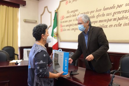 Xalapa, Ver., 05 de noviembre de 2020.- Para promover alternativas educativas y apoyar la adquisición de conocimientos en los estudiantes que se encuentran en confinamiento a consecuencia de la emergencia sanitaria generada por la enfermedad Covid-19, funcionariado y autoridades municipales entregaron equipo de cómputo portátil a representantes de instituciones educativas que se encuentran en zonas de alta y muy alta marginación.