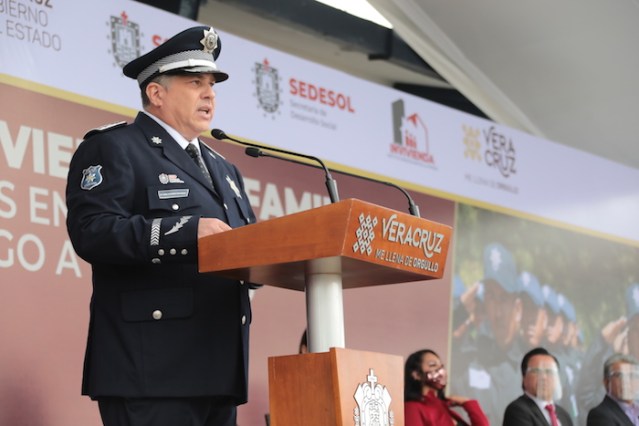 Durante la emotiva ceremonia en el Cuartel de la Policía Estatal Heriberto Jara Corona, un oficial pasó lista a los elementos caídos, mientras que la banda de guerra de la SSP entonó el Toque de Silencio. Las 46 casas entregadas este día, se suman a las 40 otorgadas en octubre del año pasado.
