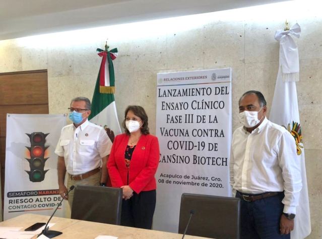Guerrero, 08 de noviembre de 2020.- Este domingo, la subsecretaria de Asuntos Multilaterales y Derechos Humanos, Martha Delgado, visitó el estado de Guerrero y junto con el gobernador Héctor Astudillo Flores y el secretario de Salud estatal Carlos de la Peña Pintos, dio arranque al inicio de la fase III de prueba clínica de la vacuna desarrollada por CanSino Biologics que se llevará a cabo en centros de salud de esa entidad federativa.