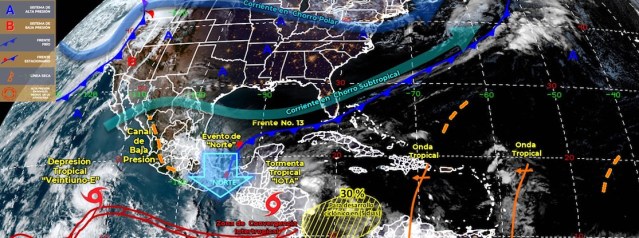 Para mañana, el frente No. 13 se extenderá con características de estacionario sobre la Península de Yucatán y el sureste del territorio nacional, interaccionará con los remanentes de “Iota” y con un canal de baja presión en el occidente del Golfo de México, ocasionando lluvias persistentes con acumulados intensos a torrenciales en Puebla, Veracruz, Oaxaca, Chiapas, Tabasco y Quintana Roo, y de fuertes a muy fuertes en Hidalgo, Campeche y Yucatán, las cuales podrían generar aumento en los niveles de ríos y arroyos, deslaves e inundaciones en zonas bajas. La masa de aire frío asociada al frente, mantendrá ambiente frío sobre entidades del norte, noreste, oriente y centro del país, con heladas al amanecer en zonas serranas de la Mesa del Norte y la Mesa Central, nieblas matutinas a lo largo de la Sierra Madre Oriental, así como evento de «Norte» muy fuerte a intenso en el sur del litoral del Golfo de México, la Península de Yucatán e Istmo y Golfo de Tehuantepec. Además, por la tarde se prevé la aproximación de un nuevo frente frio al noroeste del país.