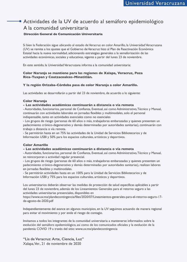 - Universitarios deberán observar medidas de protección específicas para el retorno seguro a las actividades universitarias presenciales, disponibles en https://www.uv.mx/plandecontingencia/files/2020/07/Lineamientos-generales-para-el-retorno-seguro-|7-de-agosto-de-2020.pdf