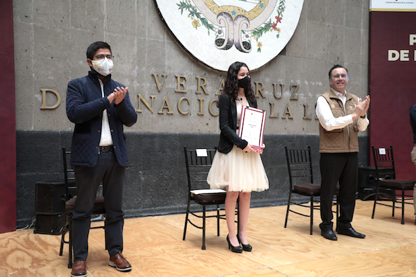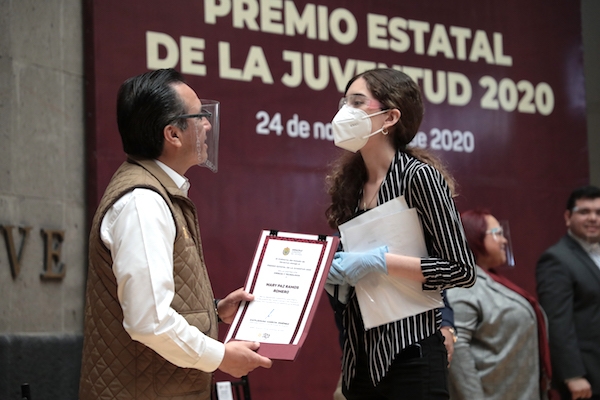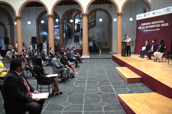 Xalapa, Ver., 24 de noviembre de 2020.- Atendiendo la convocatoria emitida el pasado 28 de septiembre, este día el gobernador Cuitláhuac García Jiménez entregó el Premio Estatal de la Juventud como reconocimiento al esfuerzo de quienes, con su talento, conducta y dedicación, contribuyen al progreso de Veracruz. Se trata de un estímulo económico de 20 mil pesos a 10 ganadores en igual número de categorías.