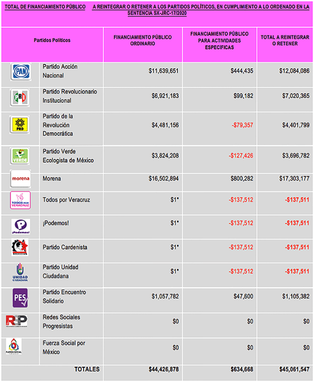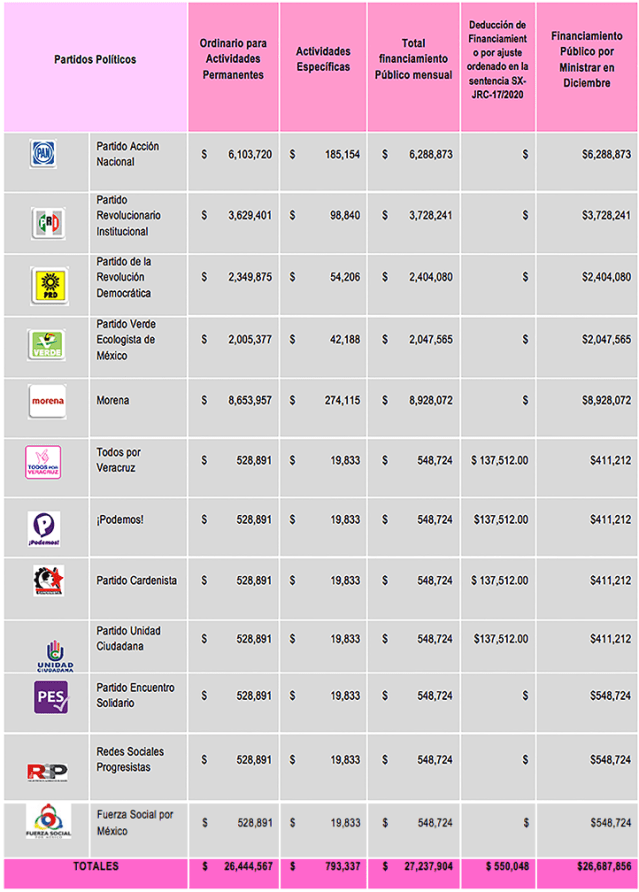 Ajustes necesarios yse determina el monto que corresponde a la ministración de financiamiento público ordinario y para actividades específicas que corresponde a los partidos políticos con derecho a recibirlo, en el mes de diciembre de 2020.