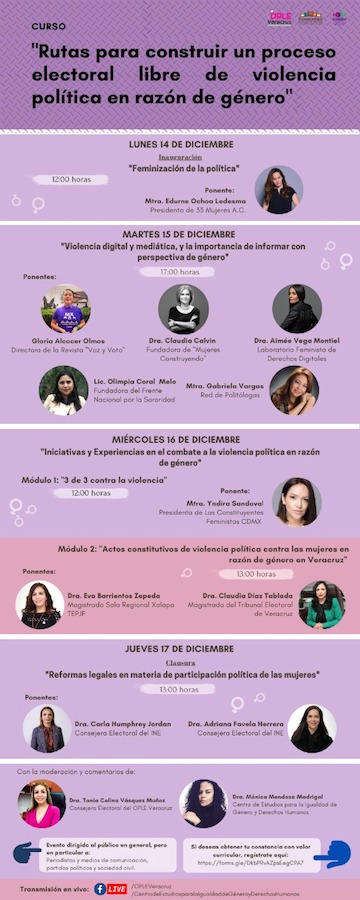 Xalapa, Ver., a 09 de diciembre de 2020.- Para abordar los mecanismos de funcionamiento del nuevo marco legal relativo a la violencia política en razón de género, se llevará a cabo del lunes 14 al jueves 17 de diciembre del presente año el curso virtual “Rutas para construir un proceso electoral libre de violencia política en razón de género”, convocado por la Consejera Electoral del Organismo Público Local Electoral del Estado de Veracruz y Presidenta de la Comisión de Igualdad de Género y No Discriminación de ese organismo, Dra. Tania Celina Vásquez Muñoz, junto con la titular del Centro de Estudios para la Igualdad de Género y Derechos Humanos de la LXV Legislatura Estatal, Dra. Mónica Mendoza Madrigal.