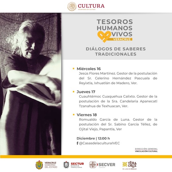 Xalapa, Ver., 11 de diciembre de 2020.- El Instituto Veracruzano de la Cultura (IVEC), a través del programa de Apoyos a Instituciones Estatales de Cultura (AIEC), transmitirá la próxima semana el programa Diálogos de saberes tradicionales por el Facebook @CasasdelaculturaIVEC, en punto de las 12:00 horas.