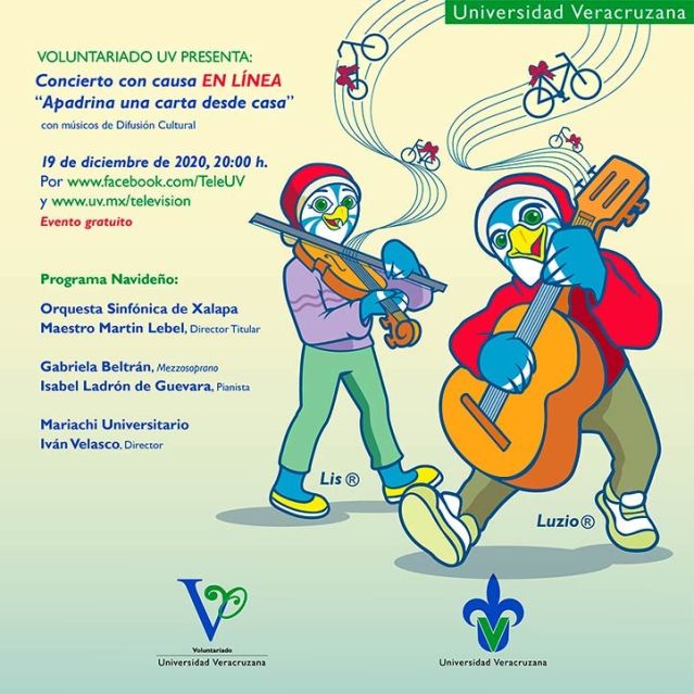 Xalapa, Ver., 15 de diciembre de 2020.- El Voluntariado de la Universidad Veracruzana (UV), con apoyo de la Dirección General de Difusión Cultural (DGDC), realizará el 19 de diciembre a las 20:00 horas el concierto con causa en línea Apadrina una carta desde casa, que tiene por objetivo recaudar fondos para la campaña del mismo nombre, a través de la cual se donarán bicicletas a niños que habitan en comunidades vulnerables, con motivo del Día de Reyes.