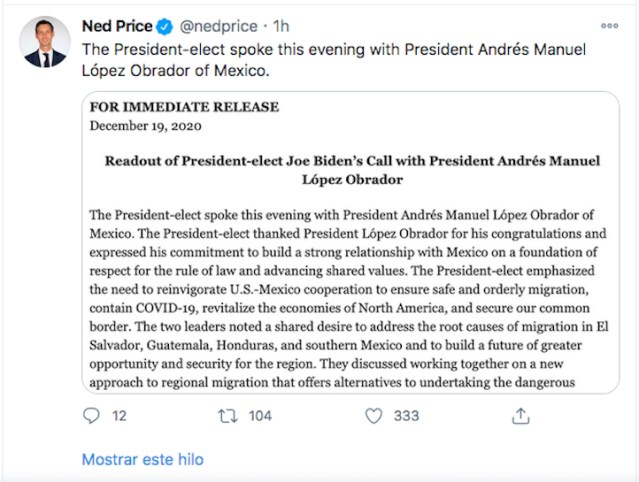 EE.UU., 19 de diciembre de 2002.- Tras la conversación telefónica de este sábado, entre el presidente Andrés Manuel López Obrador y el presidente electo de Estados Unidos, Joe Biden, Edward Price publicó un pequeño comunicado donde expuso los puntos que trataron los políticos en la llamada telefónica.