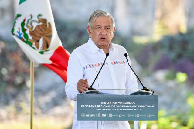 Quintana Roo, 20 de diciembre de 2020.- Durante la firma del Convenio del Programa de Ordenamiento Territorial del Sureste que define las reglas del uso de suelo en los estados de Campeche, Chiapas, Quintana Roo, Tabasco y Yucatán; el presidente López Obrador informó que la operación de los tramos 1, 6 y 7 del Tren Maya, así como los aeropuertos de Tulum, Chetumal y Palenque, sumándose al de Santa Lucía, estarán a cargo de una empresa que dependa de las Fuerzas Armadas para evitar su privatización.