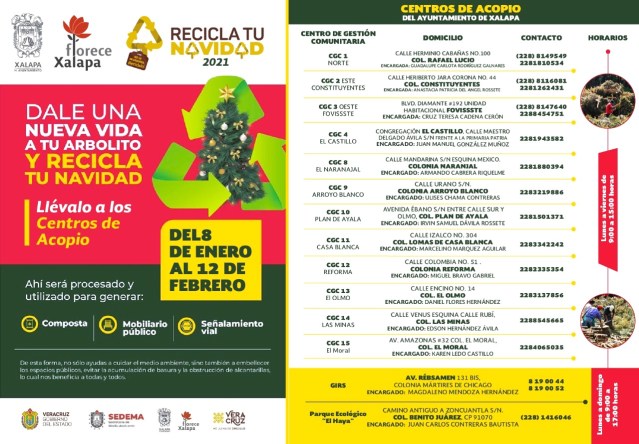 Xalapa, Ver., 06 de enero de 2021.- A partir de este viernes 8 de enero y hasta el 12 de febrero, el Ayuntamiento de Xalapa, en coordinación con la Secretaría de Medio Ambiente (Sedema), desarrollará la campaña Recicla tu Navidad 2021, con la que se espera recuperar y aprovechar la mayor cantidad posible de pinos para su reciclaje o reutilización.