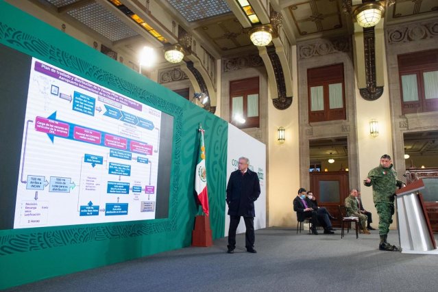 En conferencia de prensa matutina, el secretario de la Defensa Nacional, Luis Cresencio Sandoval, informó que a las 13:20 horas se desplegaron las rutas de distribución de las vacunas.